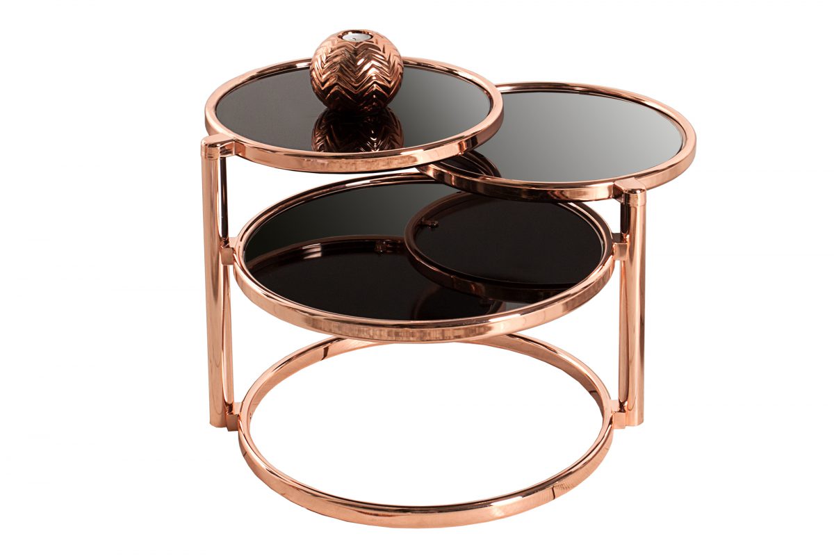 Suurus: Laius: 55cm / 155cm (min./max.) Kõrgus: 45cm Sügavus: 50cm Ø lauad: 1 x 50 cm, 2 x 40 cm Värv: vask, must klaas Materjal: metall, karastatud klaas